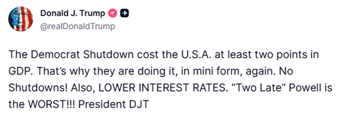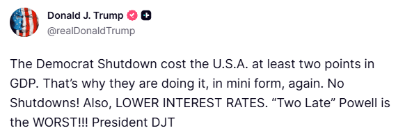 Knowing in advance how bad the number would be due to the shutdown, less than an hour before the data were released, Trump posted on social media that the shutdown would cost the US “at least two points in GDP.”
