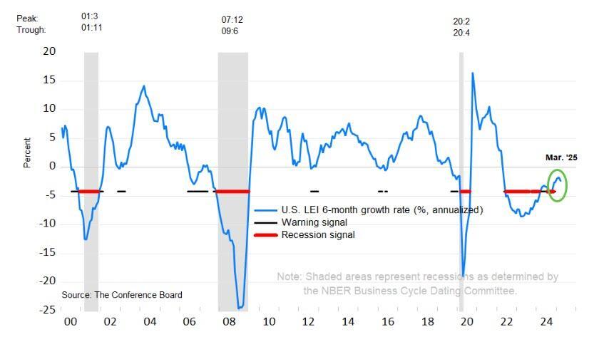 The LEI’s six-month growth rate ticked down in March, but remained well above the recession threshold