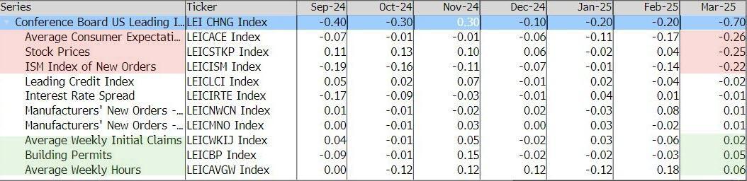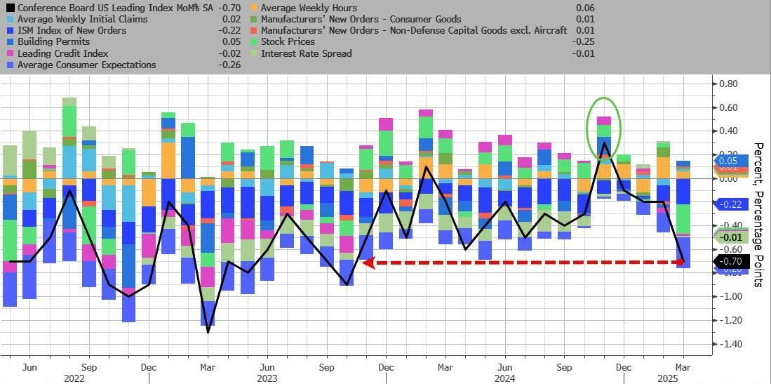 Since December's Trump-optimism-driven surge in Leading Economic Indicators (the first since last February), The Conference Board's headline index has decelerated rapidly with March data released today plunging 0.7% MoM - the biggest drop since October 2023...