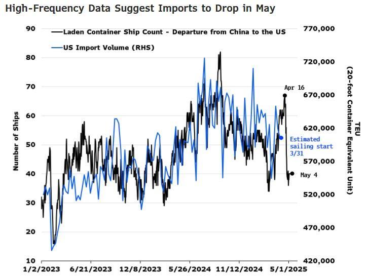 But as Goldman Sachs pointed out, this tariff-front running surge in imports as American firms stocked up on inventory, will reverse in Q2 (Bloomberg Economics sees the import surge from tariff front-running easing, based on a drop in container shipping from China to the US since April 16)...