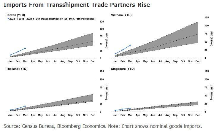 Imports from transshipment hubs surged, likely as some imports from China were diverted to third countries. Imports from Vietnam and Thailand rose well above the 75th percentile of their year-to-date pace.