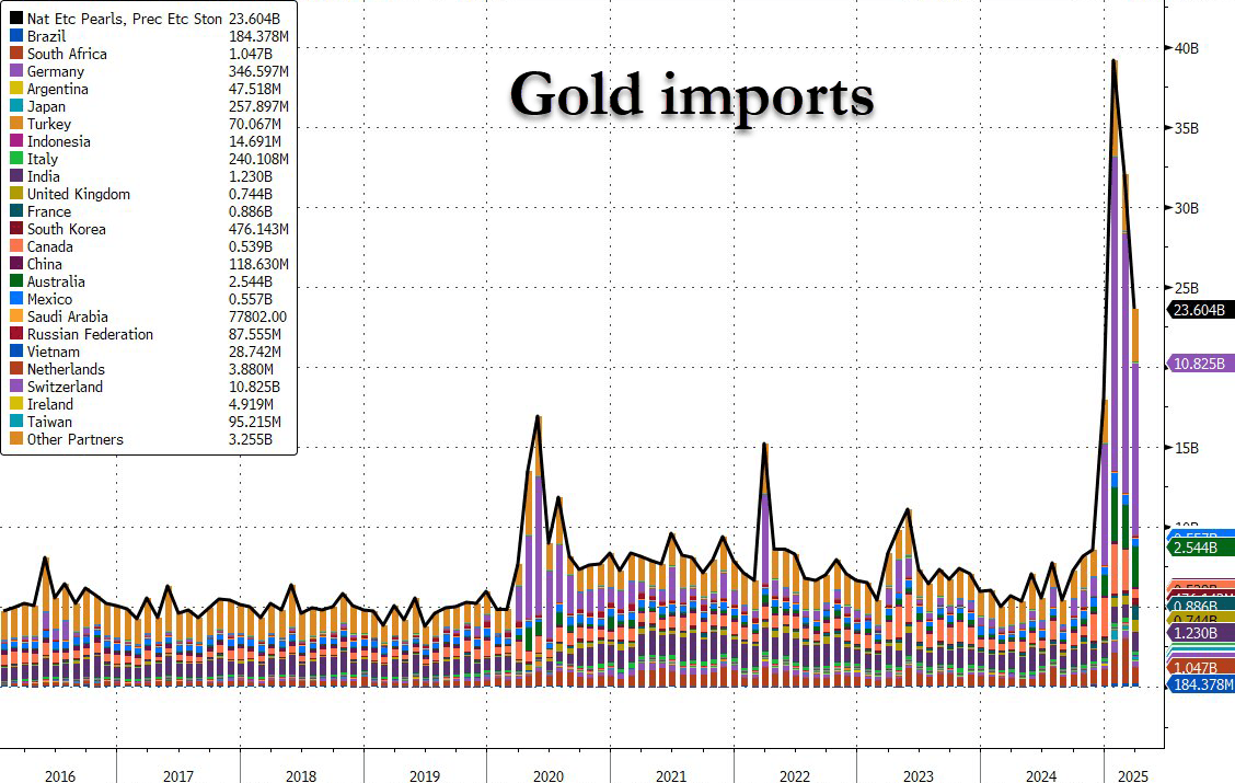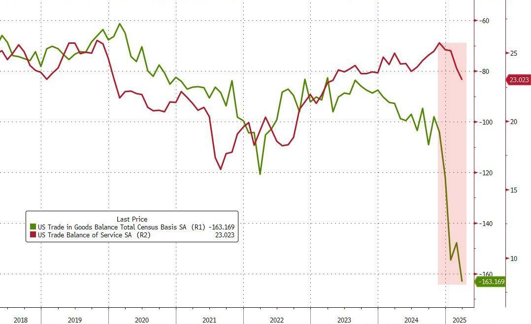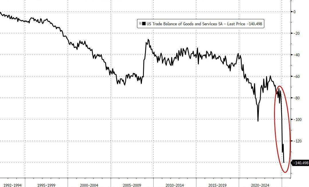 Interestingly, while the trade deficit with Canada and Mexico shrank, Mexico's trade deficit surged to a record high. The gap with Ireland surged to $29.3 billion as Goods imports from the EU surged amid a likely pull-forward in imports of pharmaceutical goods from the region.
