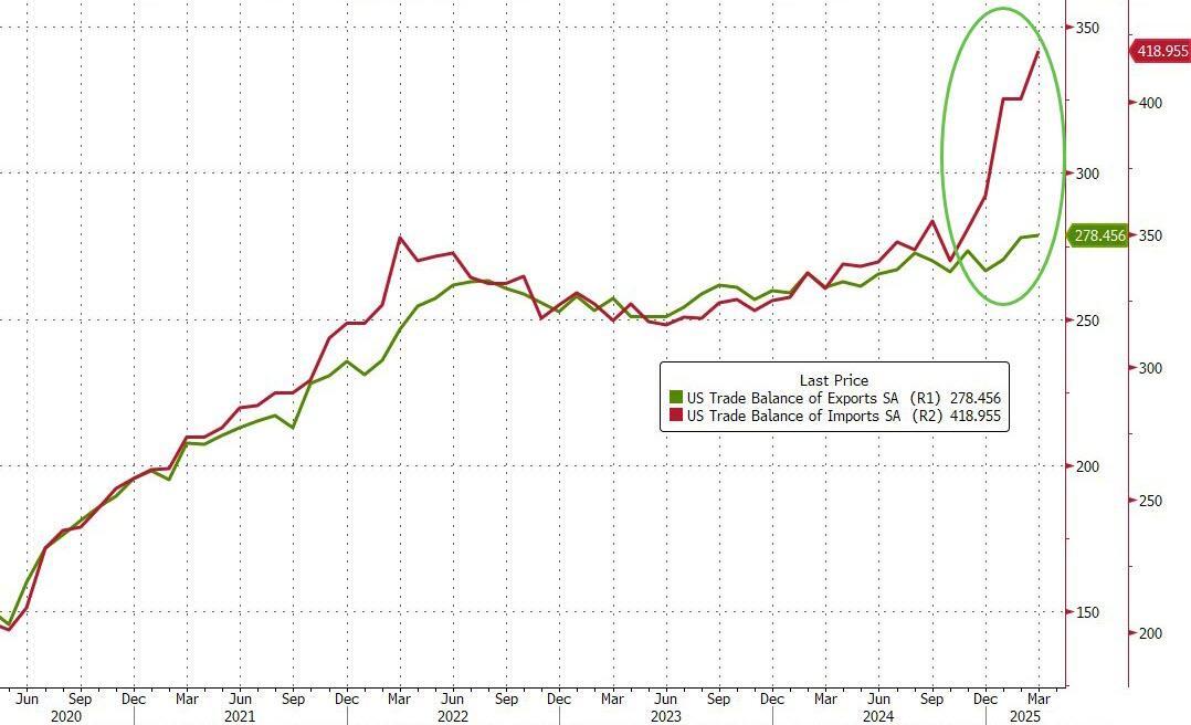 The value of imports jumped 4.4% to a record $419 billion, while exports edged up just 0.2% as firms scrambled to get ahead of President Trump's 'Liberation Day' tariffs....
