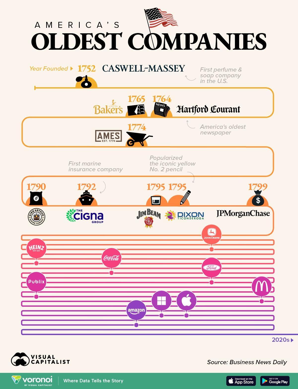 In this infographic, Visual Capitalist's Marcus Lu takes a look at America’s oldest companies founded in the 1700s. For context, this timeline also includes a selection of younger companies that are widely known.