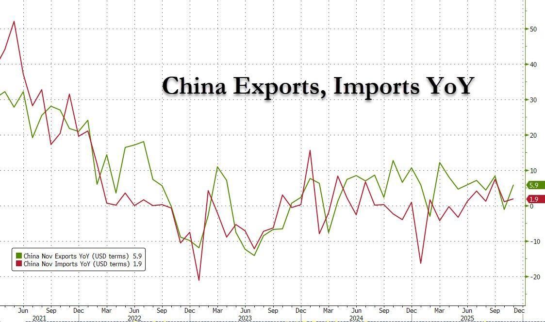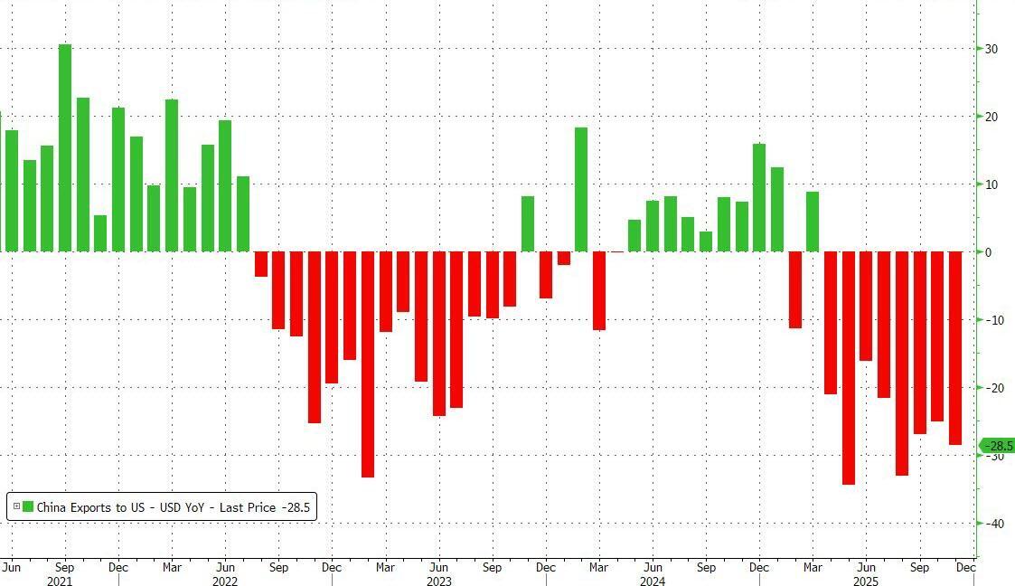 What is remarkable is that China navigated the trade war and growing economic protectionism around the world, and needed just 11 months to catapult it past the full-year record set in 2024. While shipments to the US plummeted 29% in November...
