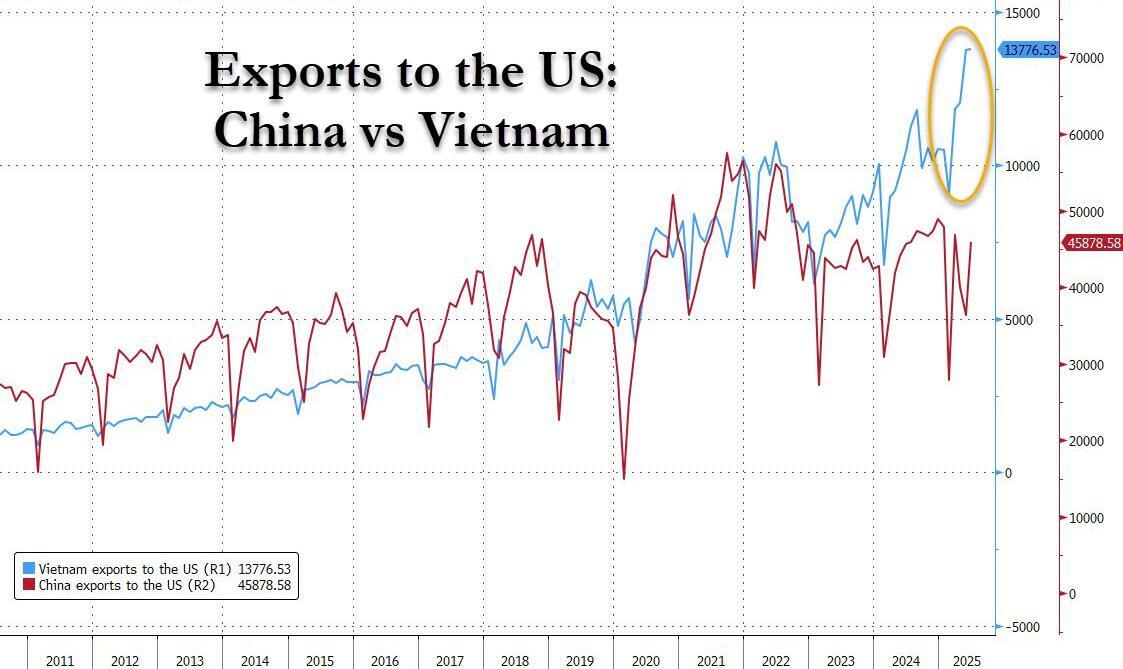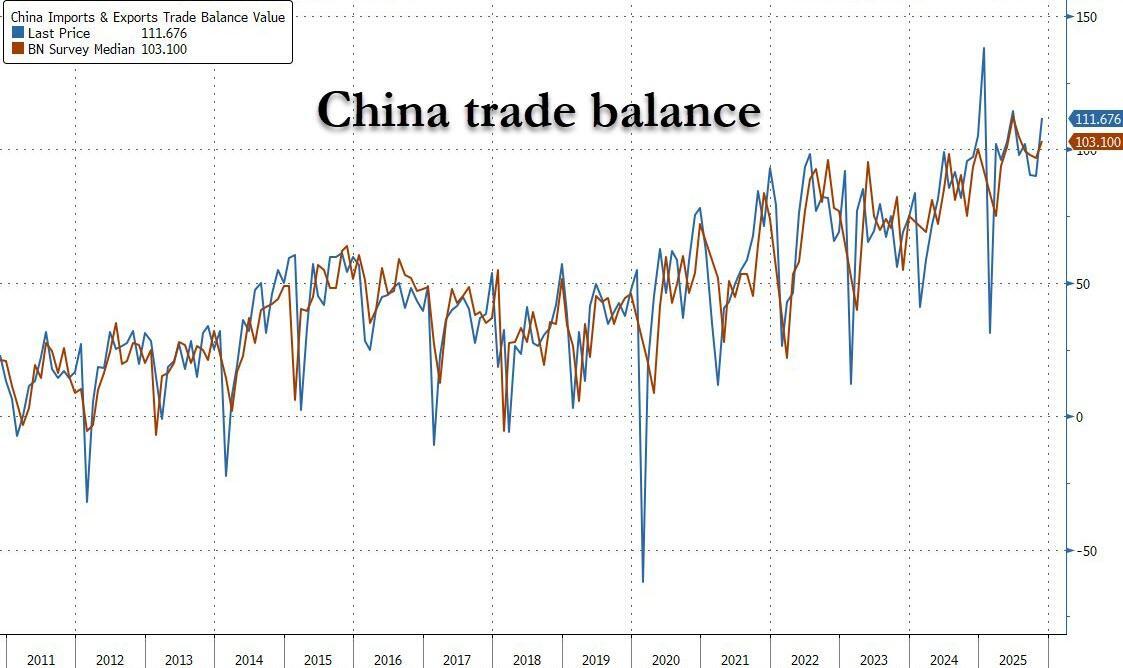 With Europe finally realizing - very belatedly, as usual - that Trump was right all along in his crusade to hammer Beijing's relentless dumping of exports to flood foreign markets with its below-cost wares as China no longer has nearly the required demand for goods and services and so has to crush and dominate foreign markets by selling at far below market prices, overnight we learned that China’s trade surplus in goods surpassed $1 trillion for the first time, highlighting the ongoing boom in the country’s exports despite US President Donald Trump’s tariff war.