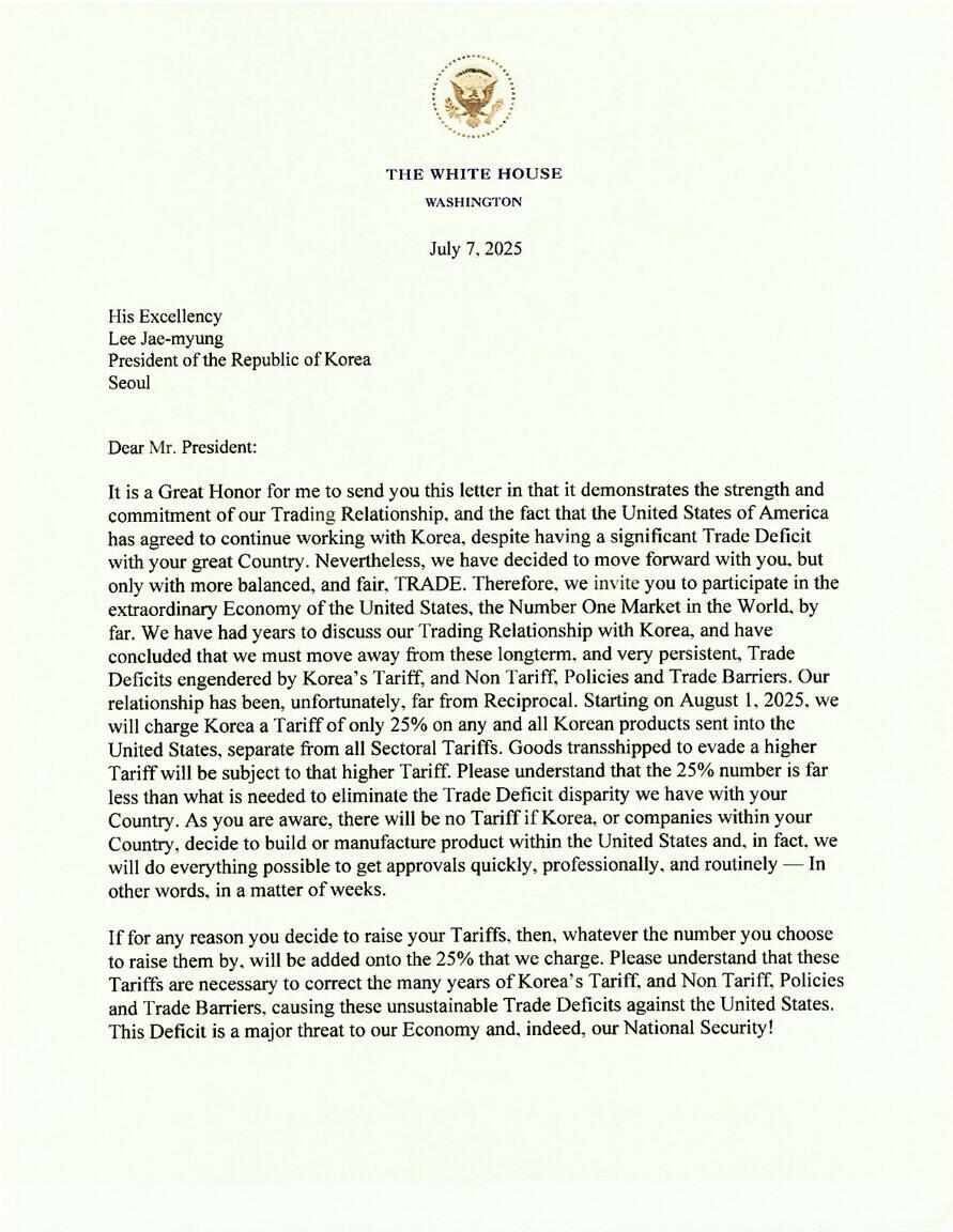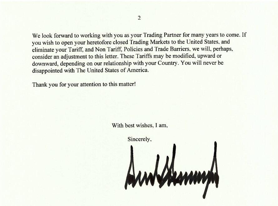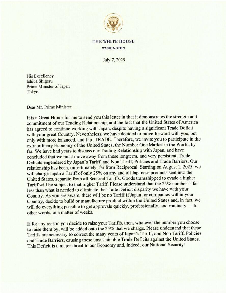 The first two trade letters were sent to South Korea and Japan, imposing a 25% tariff on all goods, effective August 1.