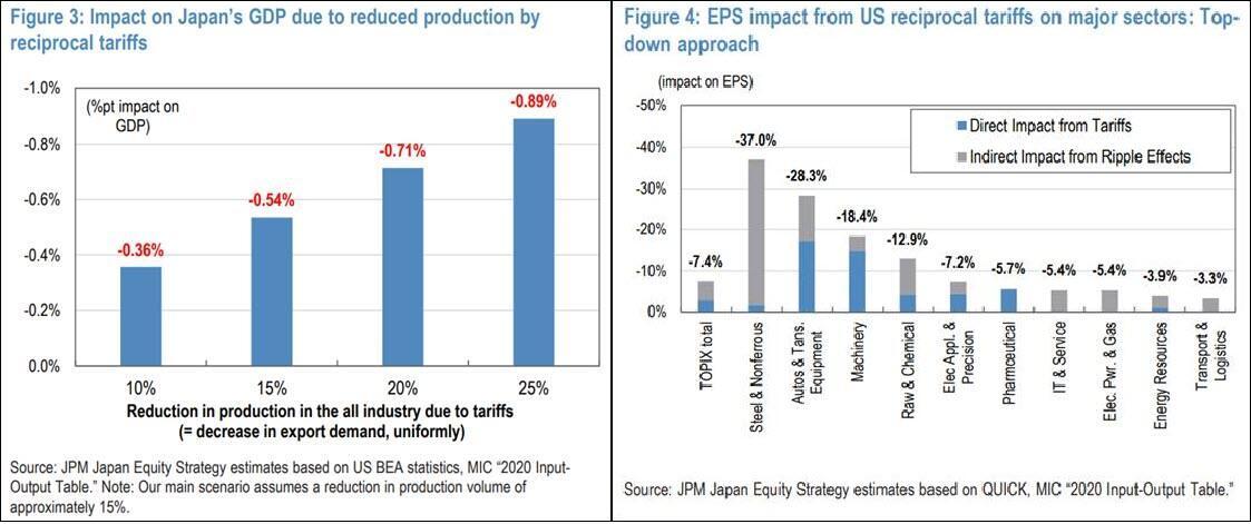 - JPM strategist Rie Nishihara expects a reciprocal tariff of 24% will lead to 0.4%-0.9% drag in Japan GDP and 7% decline in TOPIX 2025 EPS. Note that these estimates are under the assumption that the additional tariffs will be applied to products other than those subject to product specific tariffs, which is different from the language used in Trump’s latest letters (Trump said the tariffs on each country would be separate from any “sectoral” tariffs that he imposes). The downside scenario estimated by Rie for NKY is 34,000.