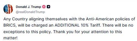 - Trump posted "Any Country aligning themselves with the Anti-American policies of BRICS, will be charged an ADDITIONAL 10% Tariff. There will be no exceptions to this policy."