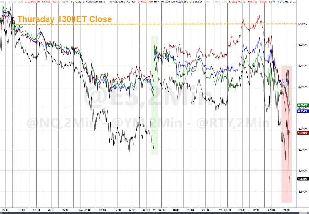Trade tensions are back in view as the 90-day deadline to reciprocal tariffs (which sparked a painful but extremely short market correction) approaches on July 9, with Trump pledging to start issuing unilateral rates to dozens of countries in the coming days. Stocks retreated at the start of a potentially volatile week as US trading partners rushed to finalize trade deals with the Trump administration ahead of the Wednesday deadline. However, one potential offset is that there are increasingly suggestions that August 1st might be the new July 9th (more below).