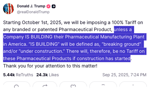 The president noted an exemption: "unless a Company IS BUILDING their Pharmaceutical Manufacturing Plant in America. "IS BUILDING" will be defined as, "breaking ground" and/or "under construction." There will, therefore, be no Tariff on these Pharmaceutical Products if construction has started."