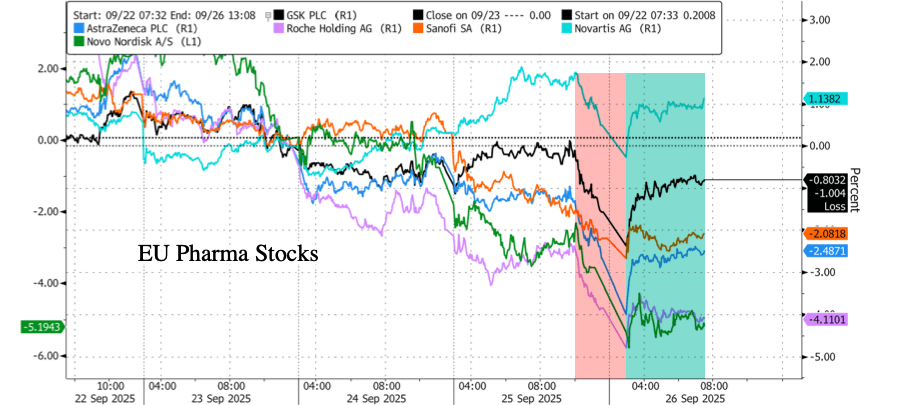 Given the exemption, European big pharma stocks held steady Friday morning after Trump's overnight tariff announcement on imported drugs, as most of these companies already have US production facilities, plants under construction, or plans to break ground.