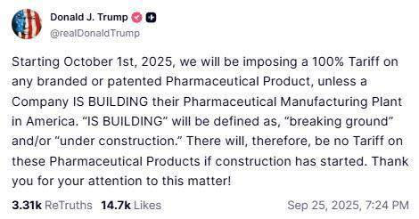 “Starting October 1st, 2025, we will be imposing a 100% Tariff on any branded or patented Pharmaceutical Product, unless a Company IS BUILDING their Pharmaceutical Manufacturing Plant in America,” Trump wrote. “There will, therefore, be no Tariff on these Pharmaceutical Products if construction has started.”