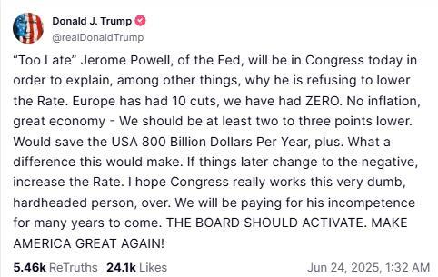 “‘Too Late’ Jerome Powell, of the Fed, will be in Congress today in order to explain, among other things, why he is refusing to lower the Rate,” Trump said on social media early Tuesday.