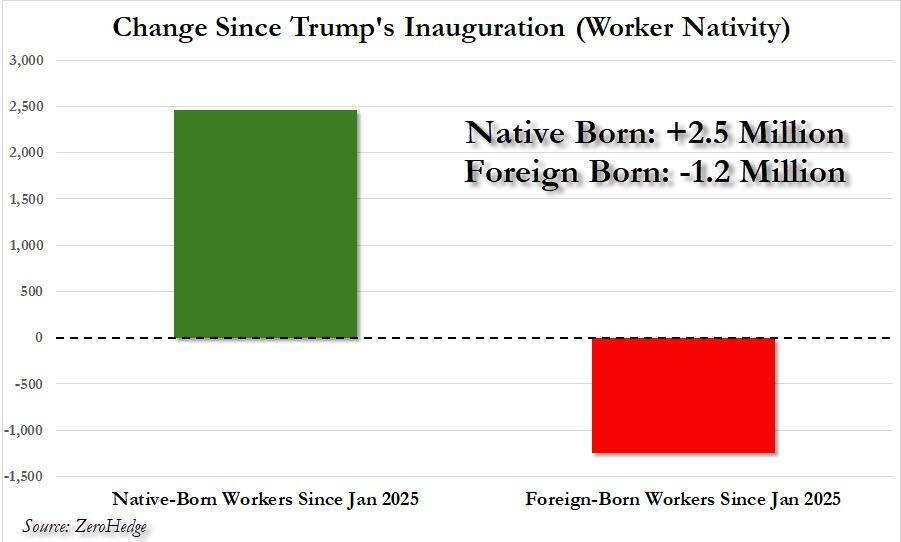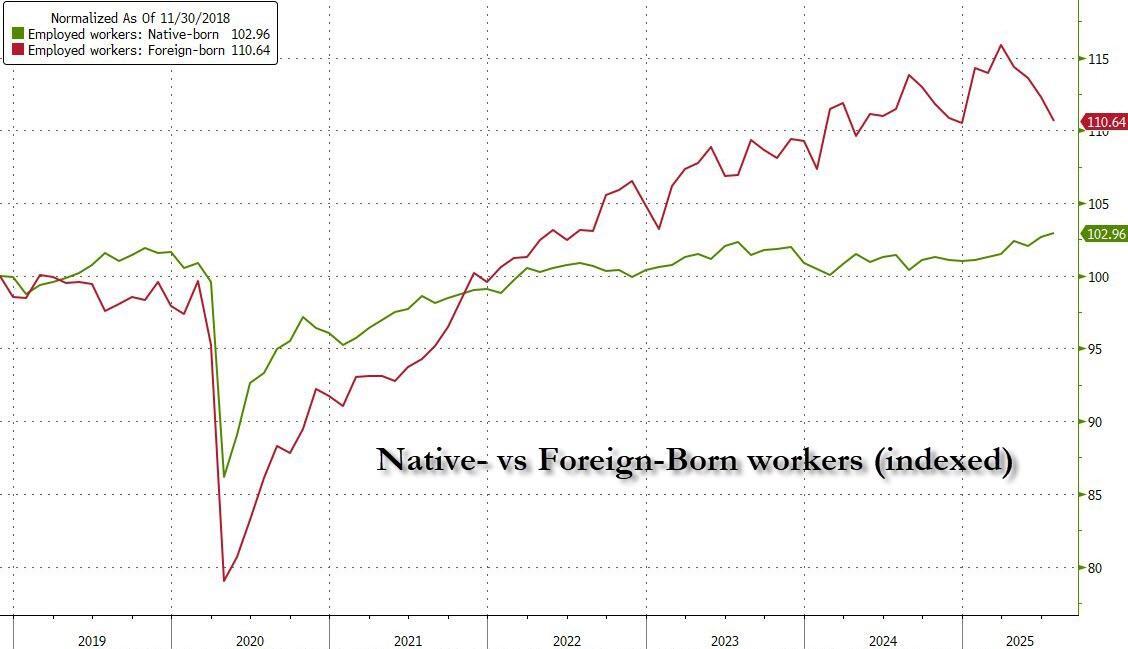 Recall, that starting back in in 2023 we warned that virtually all the job creation since 2018 had gone to foreign-born workers, which as Wall Street subsequently reported, was mostly illegal aliens.