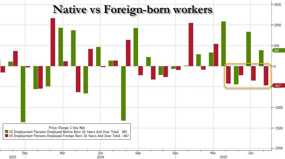 And while regular readers are well aware, it may come as a surprise to many that in the five years after 2019, the US had not added a single native-born worker, and instead all the growth in the US labor force was foreign-born. But that finally changed in the past 6 months, since Trump's inauguration.