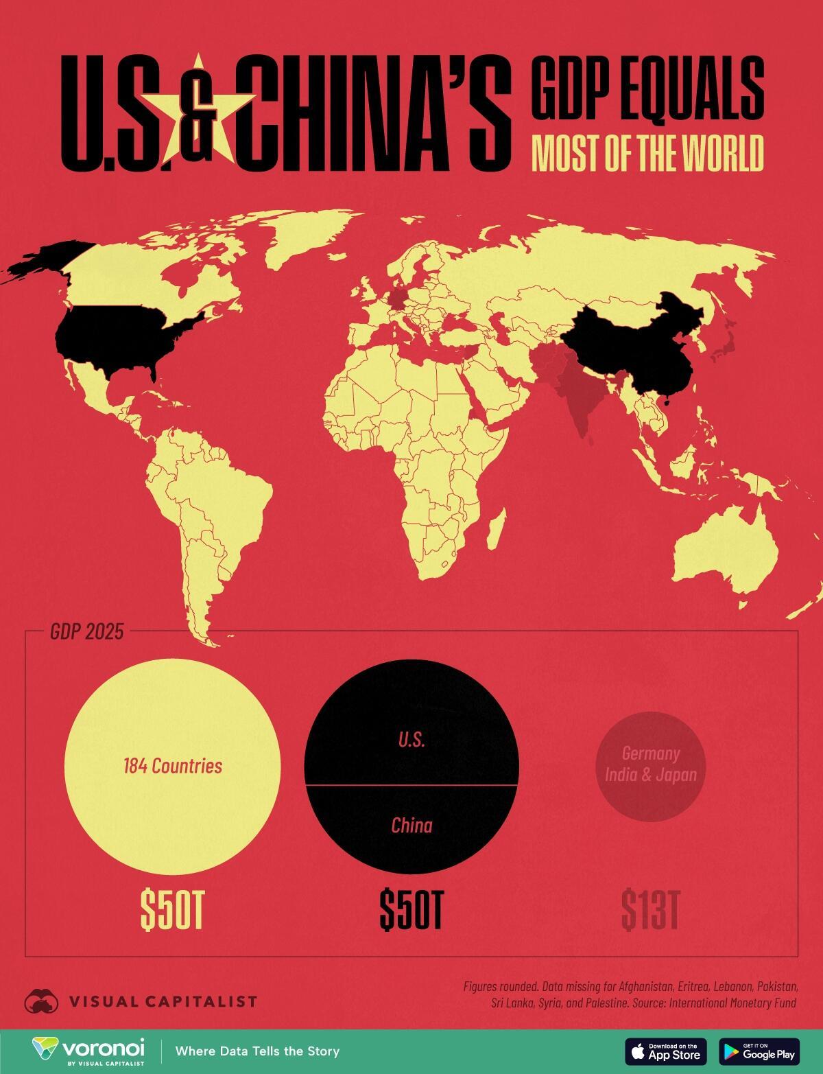 The latest estimates for 2025 have America’s and China’s combined GDP at roughly $50 trillion.