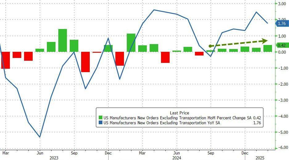 Core Factory Orders (excluding the more volatile Transportation sector) rose 0.4% MoM - accelerating on a MoM basis for the sixth straight month...