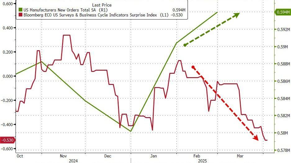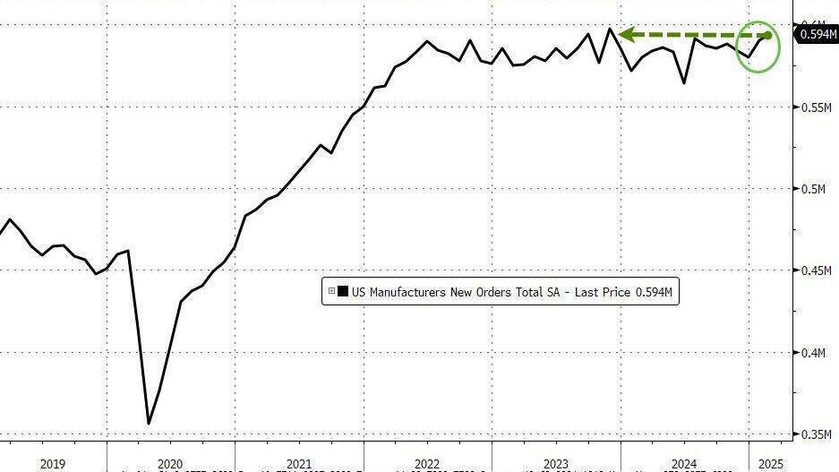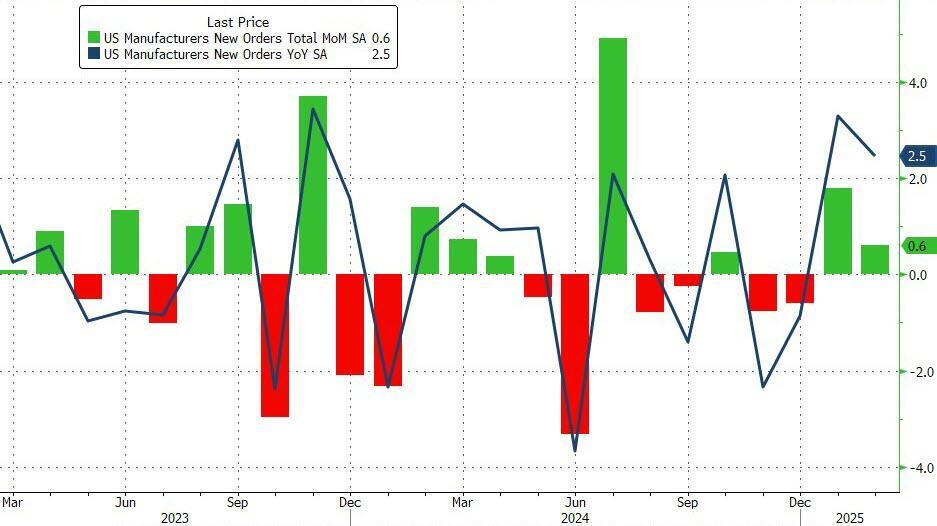 Despite all the 'soft' data slumping and legacy media narrative creation that a recession is imminent, US Factory Orders (hard data) surged for the second month in a row (beating expectations). Headline factory orders rose 0.6% MoM (+0.5% MoM exp) in March and February's 1.7% MoM jump was revised up to +1.8% MoM. This left Factory Orders up 2.5% YoY...