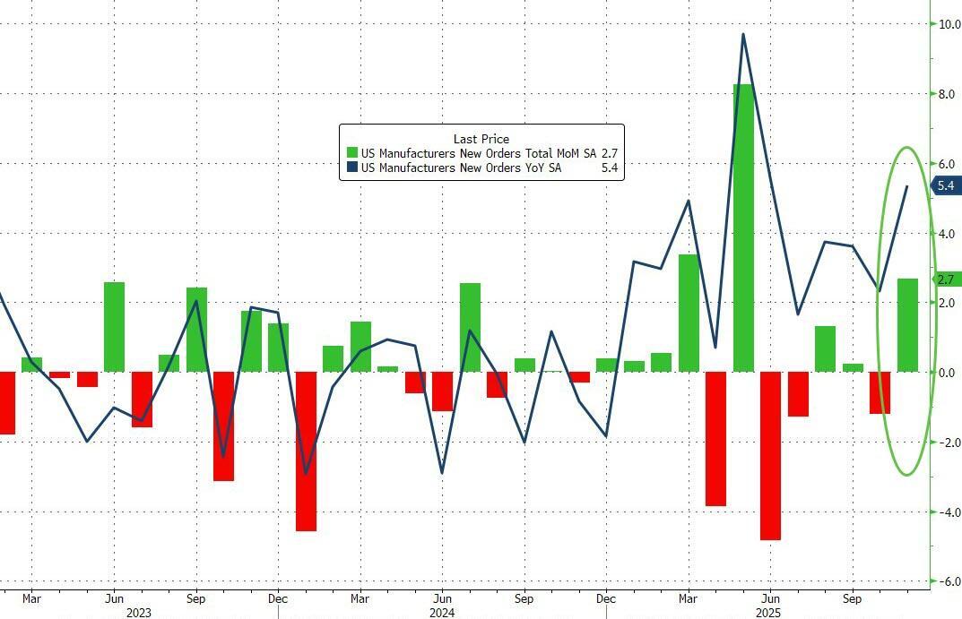 This morning we get a fresh glimpse at America's manufacturing segment - hard data - with US Factory Orders (admittedly for November) surging 2.7% MoM (significantly better than the +1.6% MoM expected), bouncing strongly from the 1.3% MoM decline in October.