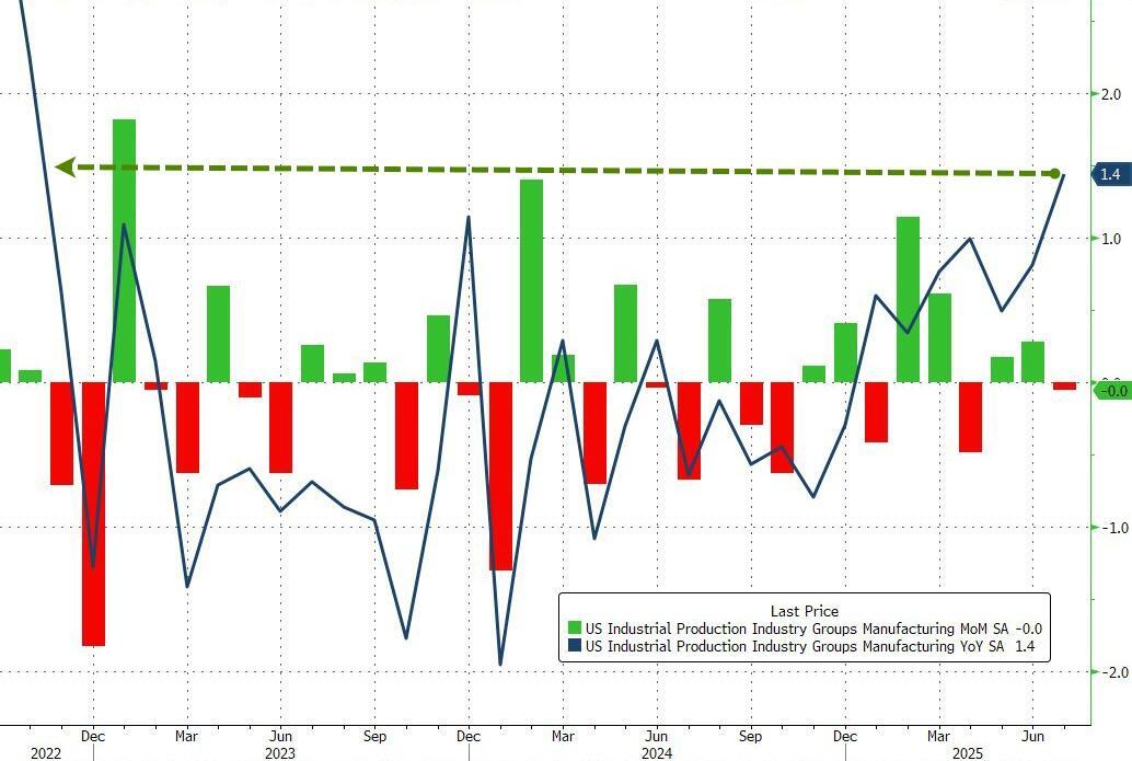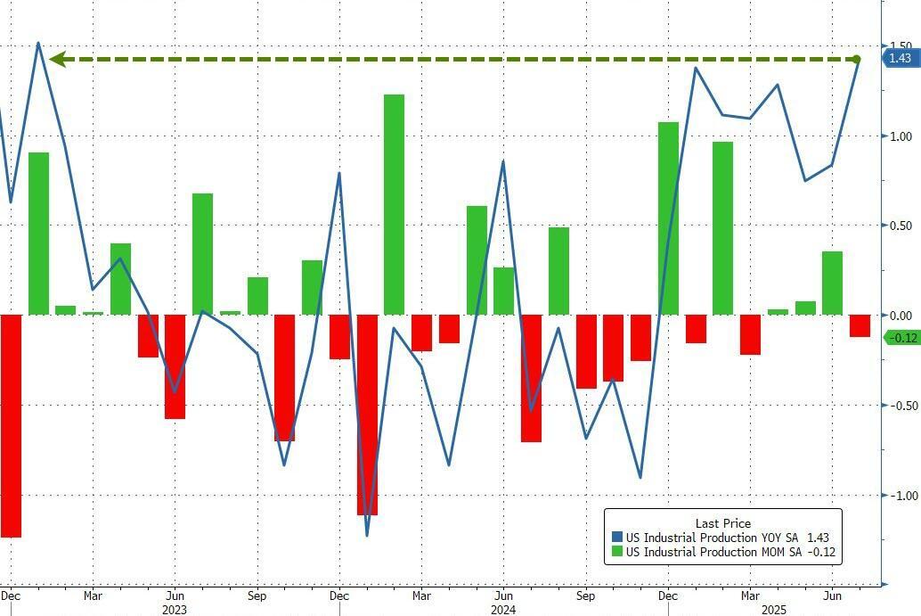 US Industrial Production dipped 0.1% MoM in July, but thanks to an upwardly revised 0.4% MoM rise in June, the YoY rise in Industrial Production was +1.43% - the biggest YoY jump since Jan 2023...