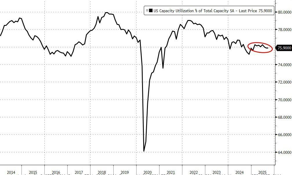But the big headline of this (admittedly lagged) report is the weakness in Capacity Utilization at just 75.9% in September (well below the 77.4% print for August, which was revised down to 75.9%, and a big miss versus the 77.2% exp)