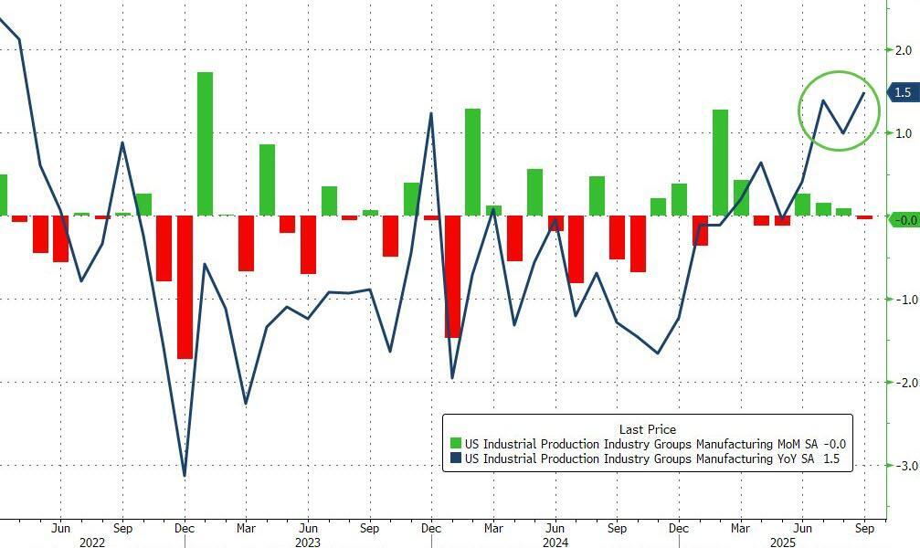 US Manufacturing output was unchanged in September (slowing from the 0.1% MoM rise in August), but, like IP, that supported a 1.5% YoY rise in output, its highest level since April 2022...