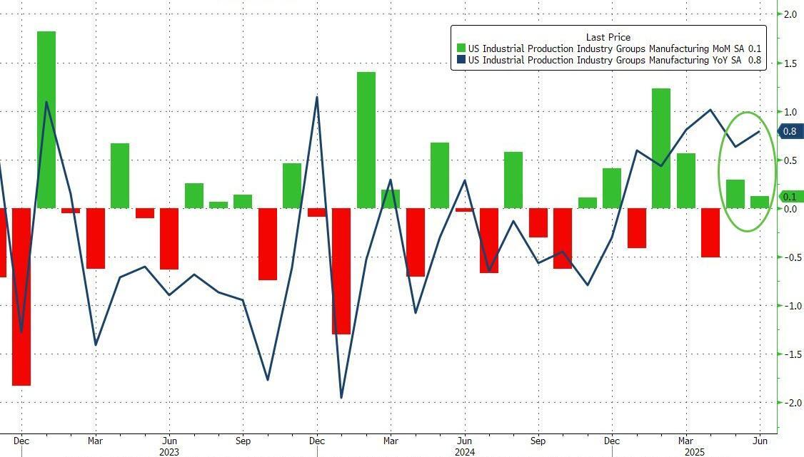 Drilling down, we see Manufacturing output also jump in June (+0.1% vs 0.0% exp), lifting the YoY growth to +0.8%...