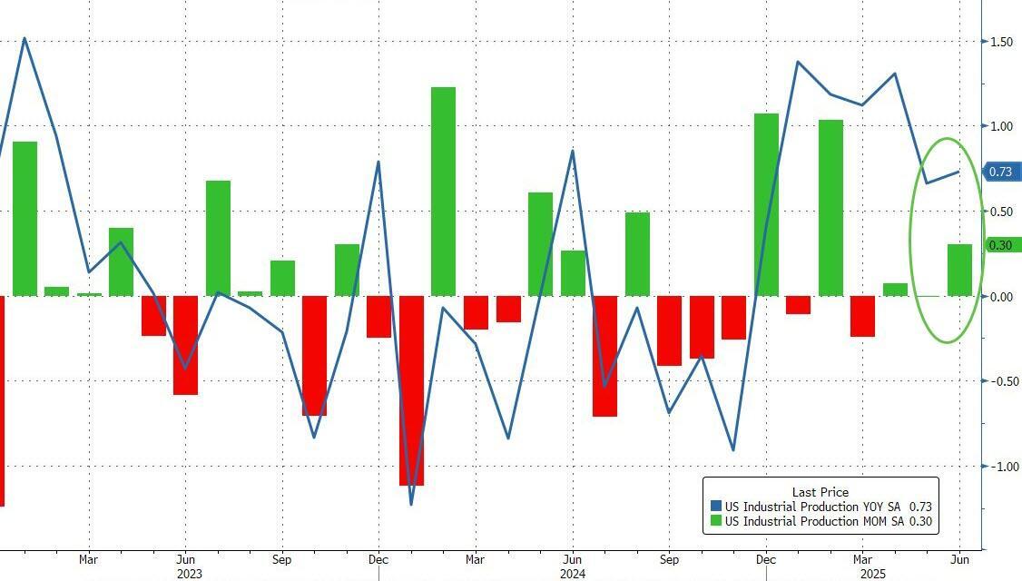 US Industrial production rose significantly more than expected in June (+0.3% MoM vs +0.1% MoM exp) with May's 0.2% MoM decline revised up to unchanged. This left Industrial production up 0.73% YoY...