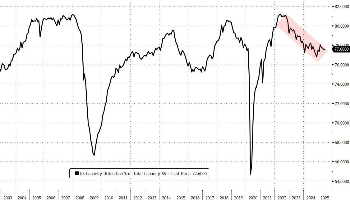 Additionally, Capacity Utilization ticked up very modestly but remains in a downtrend...