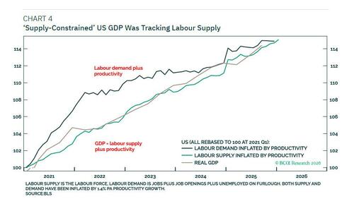 In a normal demand-constrained economy therefore, a demand recession causes a GDP recession. In a supply-constrained economy however, it takes a supply recession to cause a GDP recession. This explains why the abnormally supply-constrained US economy cheated a GDP recession when demand went into recession through 2023-24. The growth in the constraint – labor supply – kept output growing.