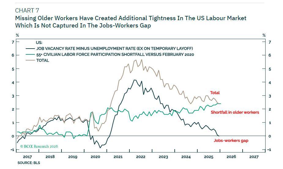 The reason that wage inflation has gapped structurally higher versus the jobs-workers gap is that the composition of the US labor market has structurally changed. As I highlighted in Why The World’s Fate Hangs On 2.5 Million Older American, there are almost 3 million fewer older workers in the US labor supply now than before the pandemic.