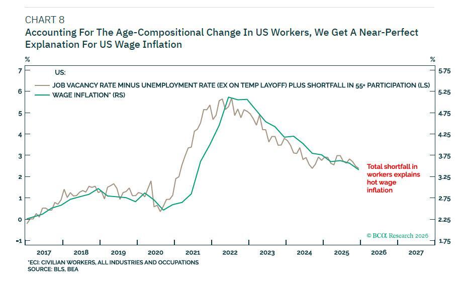 Therefore, the shortfall of older workers has created an additional tightness in the US labor market which is not captured in the aggregate jobs-workers gap. Once we account for this additional tightness, we get a near-perfect explanation for the evolution of US wage inflation.
