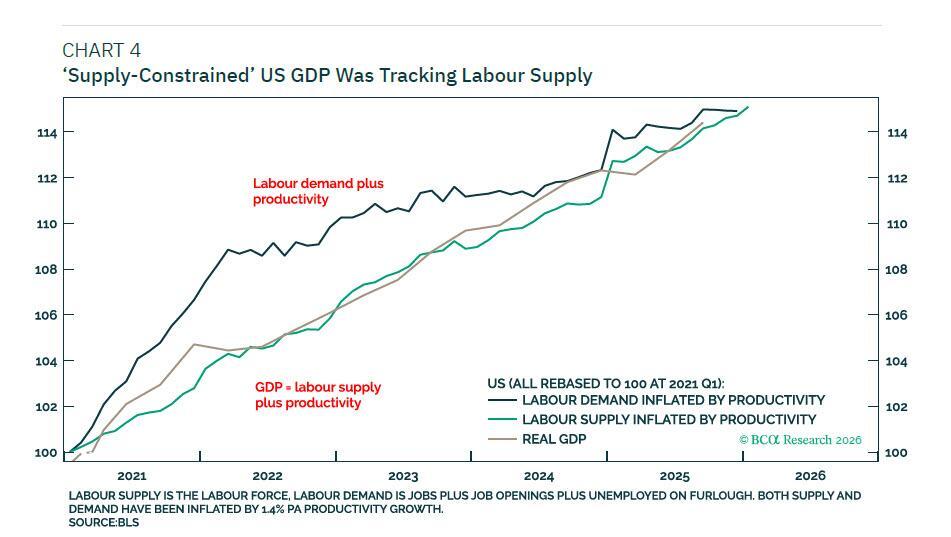 Now though, the US economy is at a watershed that puts it in ‘double jeopardy’. Given that labor demand and labor supply are in perfect balance, a drop in either would cause output to contract.