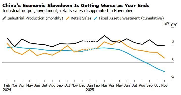 China’s economic momentum slowed broadly in November, with a marked weakening in consumer spending, adding pressure on Beijing to stabilize household and business demand in the world’s second-largest economy.
