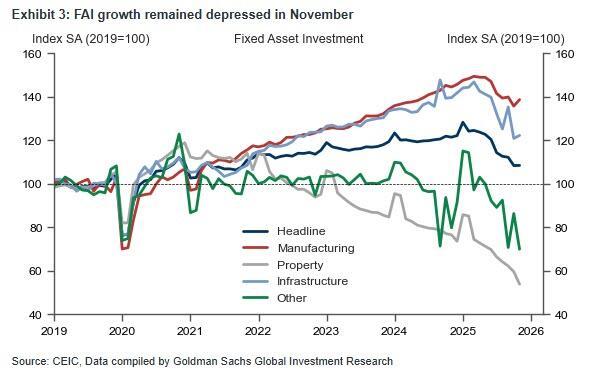 Fixed asset investment (FAI) maintained its double-digit year-on-year contraction in November on a single-month basis, though we would not over-interpret its recent slump as our study suggests that the NBS statistical correction of previously over-reported data has played at least as large a role as fundamental factors (e.g., the "anti-involution" policies and a prolonged property downturn).