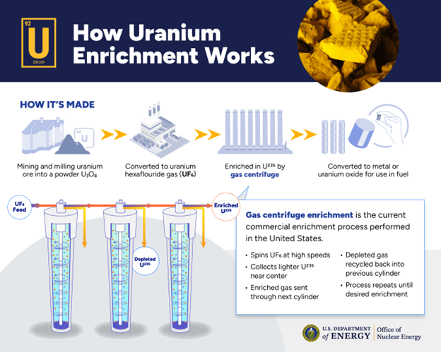 Orano, a French enrichment company majority owned by the French government, was awarded $900 million for developing and constructing their planned LEU enrichment facility in Tennessee. They have vaguely discussed their intended plant size, but have remarked it will have a capacity in the “millions of SWU”. Separate Work Unit (SWU) is the measurement of uranium enrichment production capacity, with Russian imports currently clocking in at roughly 3-4 million SWU/yr.