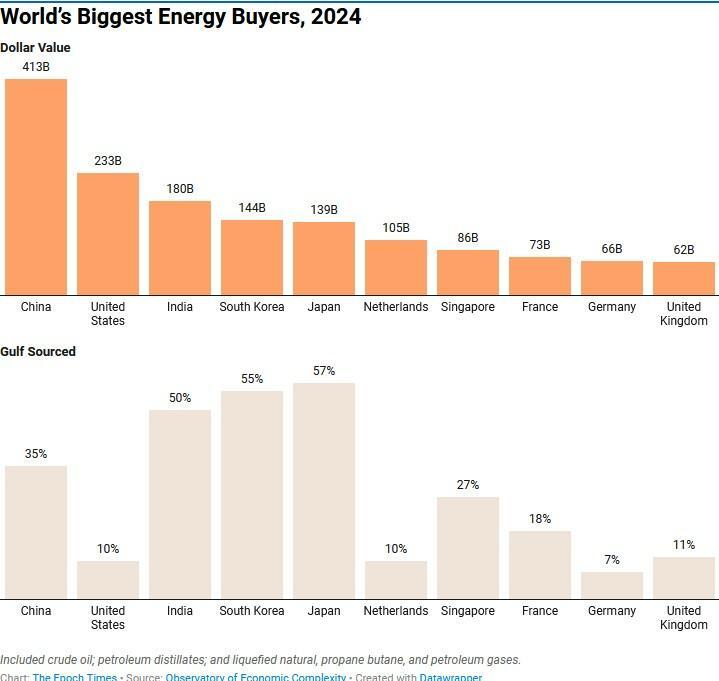 Japan (57 percent), South Korea (55 percent), and India (50 percent) relied on the Gulf nations for at least half of their oil and gas imports in 2024. China sourced roughly 35 percent of its supplies from the region.