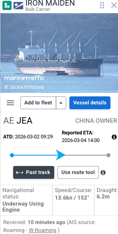 Bloomberg data shows the bulk carrier Iron Maiden has successfully transited the narrowest part of the waterway without incident.
