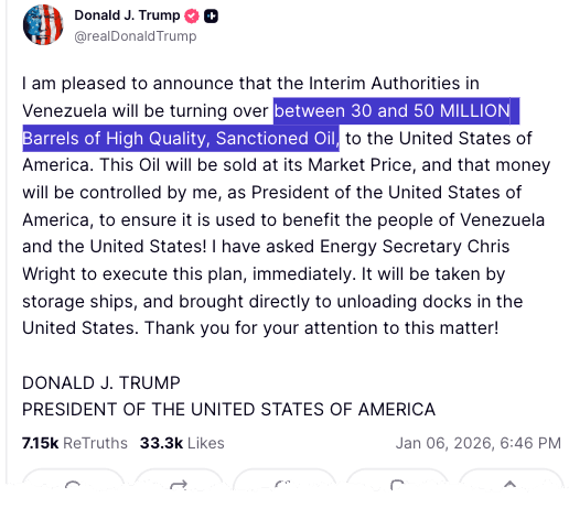 Earlier, Wright was featured at the Goldman Energy, Clean Tech & Utilities Conference in Miami. He told the audience, including executives from Chevron, ConocoPhillips, and other major oil and gas majors, about the Trump administration's plans for Venezuela's oil sector following last weekend's regime change led by America's Delta Force operators (implying the toppling of Nicolás Maduro).