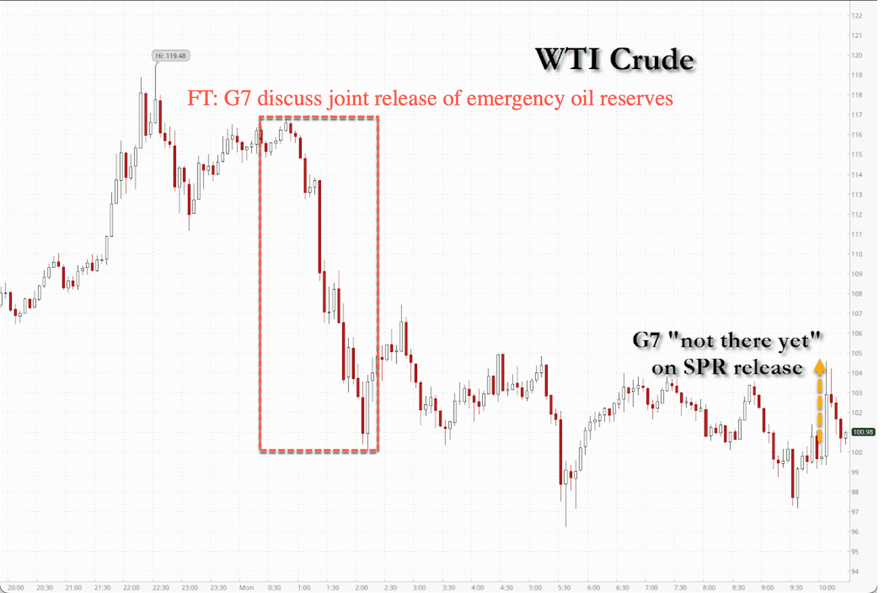 You know conditions are deteriorating very quickly when the Financial Times reports that G-7 finance ministers are set to hold an 8:30 a.m. New York time call to discuss a possible coordinated release of strategic oil reserves to combat runaway crude prices, as Brent crude hit $119/bbl overnight. Such a move to dump SPR on global markets shows just how afraid policymakers are that the oil shock could crush consumer sentiment and, in turn, hit economic growth.