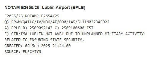 Another Notice-to-Airmen (NOTAM) has been issued for Eastern Poland by the Polish Civil Aviation Authority within the last few minutes, this time for Lublin Airport, stating that the airport is unavailable due to “unplanned military activity related to ensuring state security.”