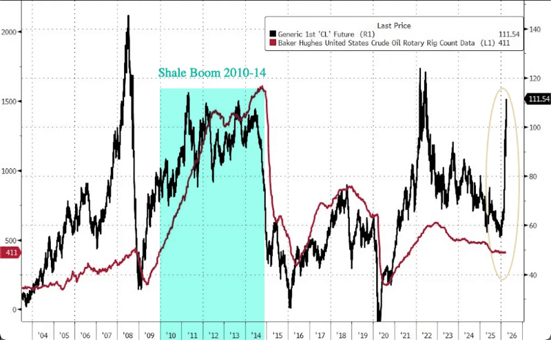 Last month, roughly three weeks into the U.S.-Iran conflict, UBS chief economist Arend Kapteyn told clients that one reason this Middle East energy shock is "not like the 2011-2014 shale boom" is the lack of a comparable response from the U.S. shale patch. In other words, the oil shock was viewed as temporary by major shale players and not worth adding new drilling rigs to the mix.