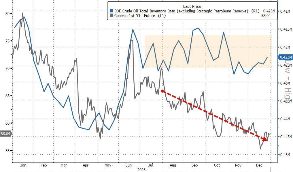 The US Crude Oil Total Inventory (excluding Strategic Petroleum Reserve) fell to 422,888 thousand barrels in the week ending Dec. 26, 2025, lowest since Oct. 31, 2025... decoupling from the crude price...