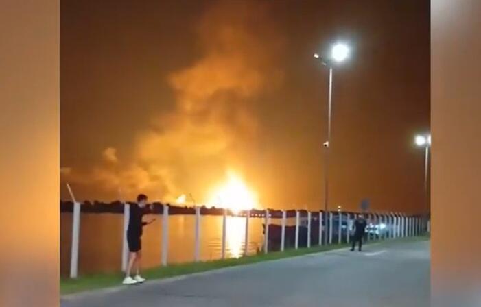 Social media video has emerged of a large fireball above the gas facility accompanied by sounds of loud anti-aircraft fire, right near the Danube river which forms the border between the two countries.