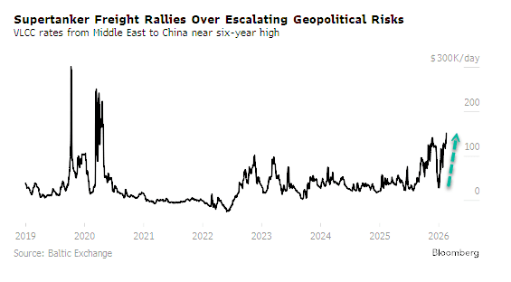 Bloomberg cites VLCC earnings data from the Baltic Exchange showing that rates on the Middle East-to-China shipping route have tripled this year to about $151,208 per day, the highest rate since 2020.