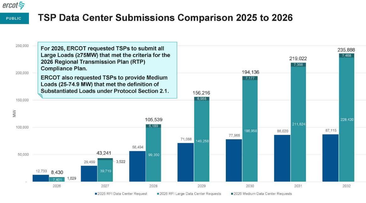Peak demand in the Electric Reliability Council of Texas (ERCOT) territory could more than quadruple to 367,790 MW by 2032, driven primarily by data centers as well as other large load customers, the grid operator said in a preliminary forecast published Wednesday and noted by Utility Dive.