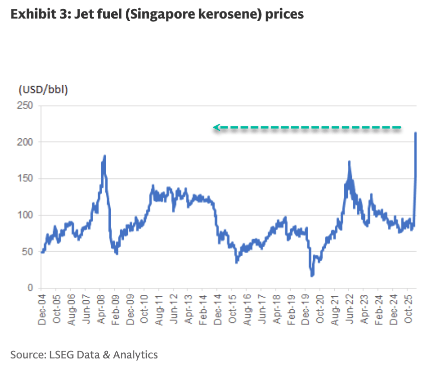 We outlined the early signs of global demand destruction and worsening energy chaos in a note earlier on Monday, mapping the regional dominoes and the order in which they are likely to fall. Turning to the UK, the last known jet fuel shipment from the Middle East is due to arrive later this week, a major warning that aviation disruptions could soon materialize.