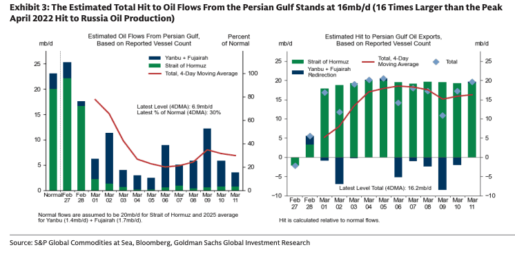 The estimated total hit to oil flows from the Persian Gulf stands at 16 mb/d (16 times larger than the peak April 2022 hit to Russian oil production).