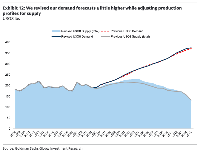 As we highlighted in “Why The Price Of Uranium Is About To Soar,” a widening cumulative net deficit of 211 million pounds between 2025 and 2045, driven by reactor builds in China, Russia, and the United States, is already pushing long-term prices higher. Spot uranium recently traded near $86 per pound, with Goldman Sachs models pointing to roughly $91 by year-end 2026.